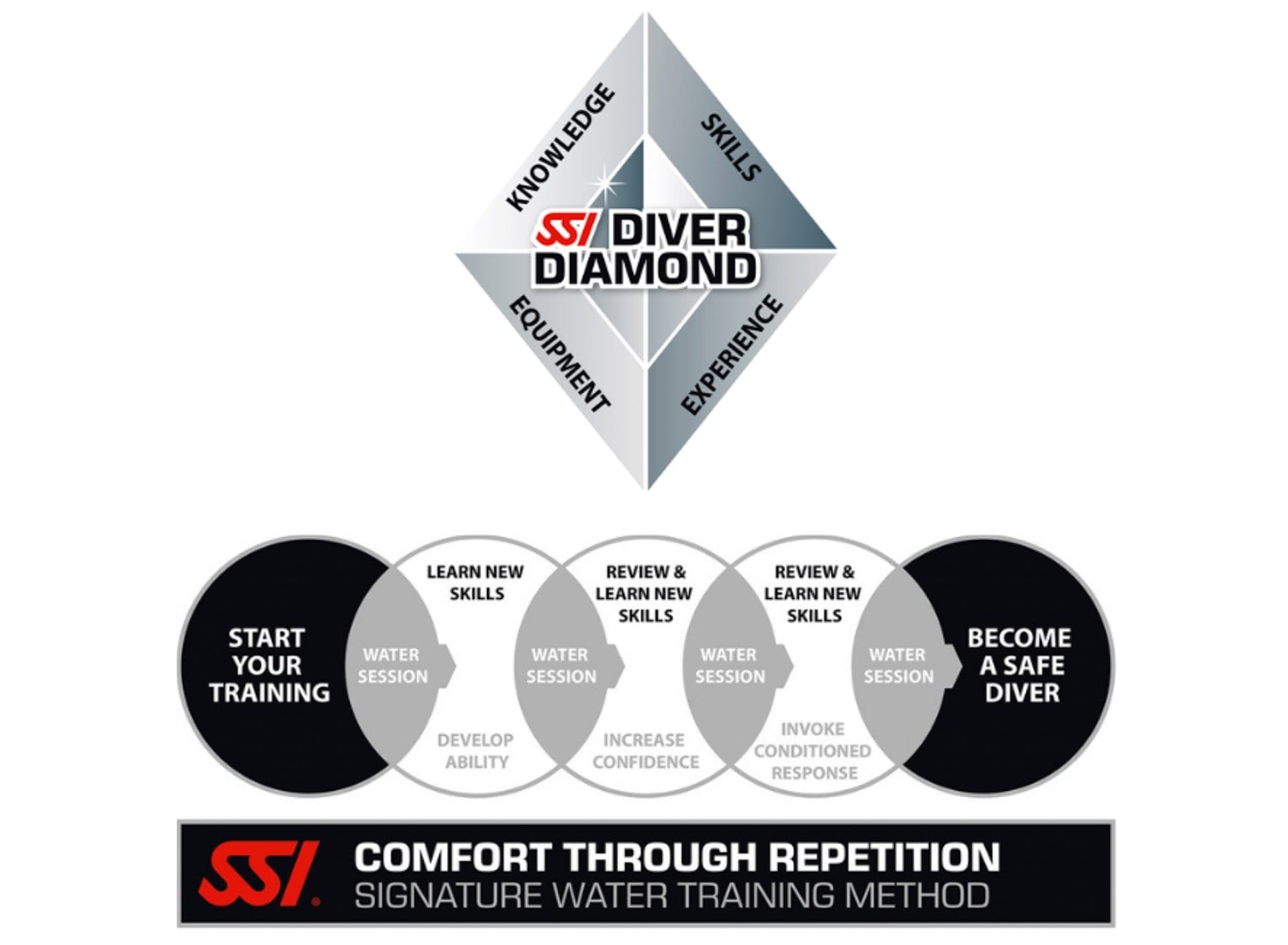 The SSI range of programs is one of the most effectively designed and thoroughly tested diver education systems in the world. There are four distinct components to becoming a diver — proper knowledge, skills, equipment and experience. We call this the SSI Diver Diamond. SSI focuses on real-world teaching ability, not memorization. Candidates are trained to become thinking instructors who can adapt, manage risks, and deliver high-quality education in any environment.
